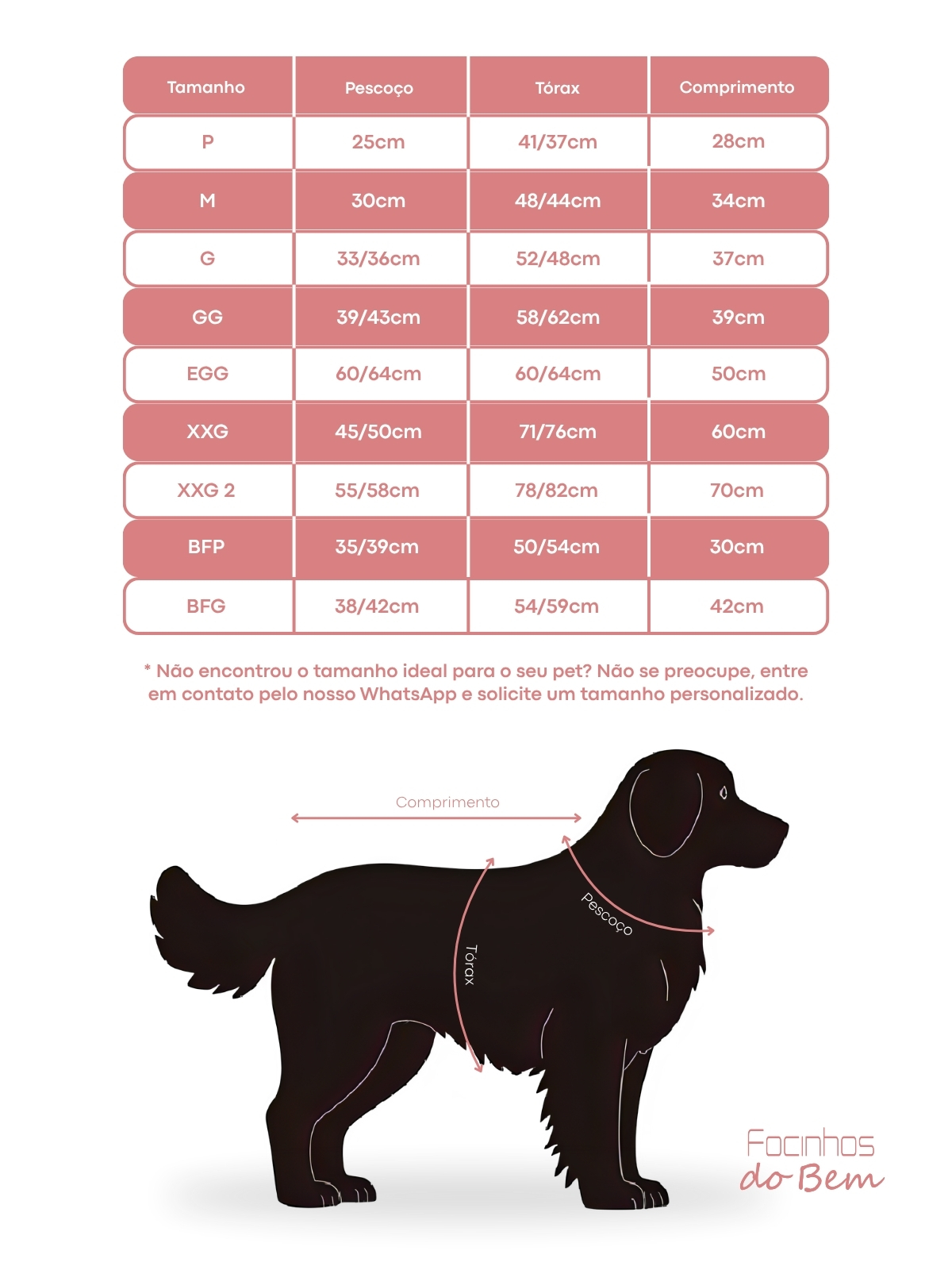 Os tamanhos BFP e BFG são indicados para cães das raças pug e bulldog francês. Já o tamanho EGG é indicado para cães do porte do bulldog inglês. Os tamanhos XXG e XXG2 são indicados para cães do porte de um Golden Retriever, Labrador, Border Collie...